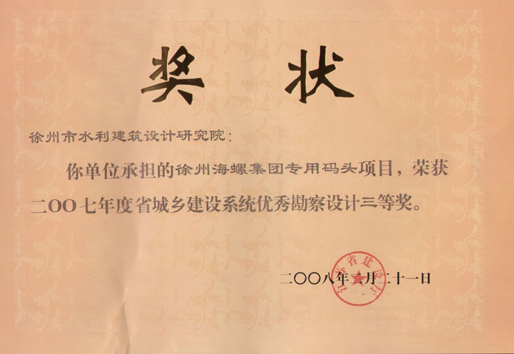 《海螺集團碼頭》07年度省城鄉系統優(yōu)秀勘察設計三等獎(2008.2)