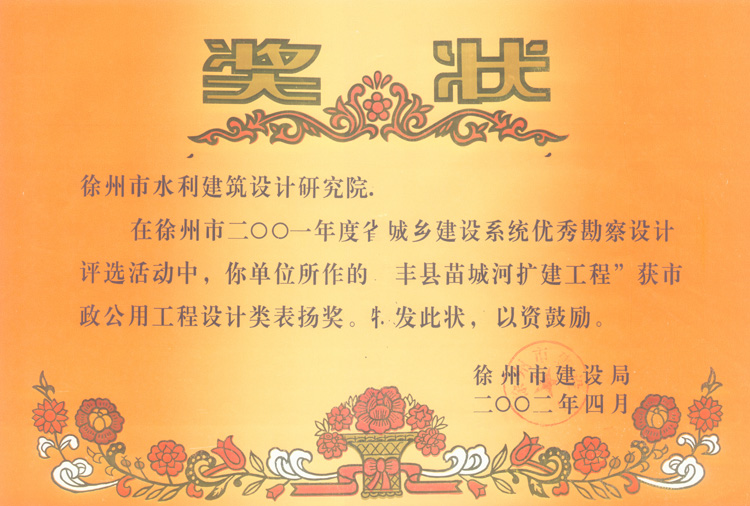 《豐縣苗城河擴建工程》市設計表?yè)P獎(2002)